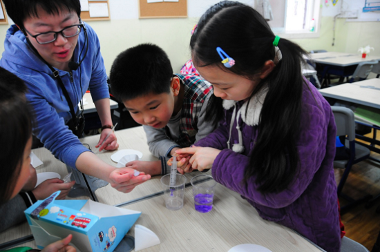 对于二年级同学来说,班会课就是一场见证湿地魔法的神奇之旅。志愿者们以“湿地——大自然的魔法师”为主题,通过简单的实验,让同学们了解湿地作为“地球之肾”净化水质的原理——当看到被彩砂“污染”了的浊水,经过针管过滤器后,重新恢复了清澈的模样,孩子们禁不住感慨,“原来湿地可以过滤掉有害物质,太厉害了!”